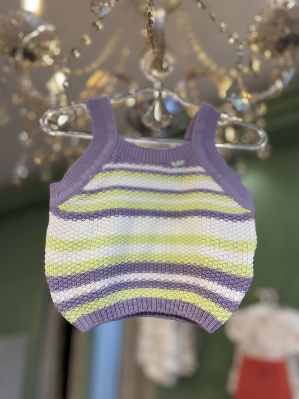 Destaques da peça: - Tricot de alta qualidade para conforto prolongado - Design listrado em tons lilás, verde e branco, que traduz delicadeza e sofisticação - Ajuste perfeito para o corpo infantil, garantindo liberdade de movimento - Ideal para o verão, com toque leve e respirável