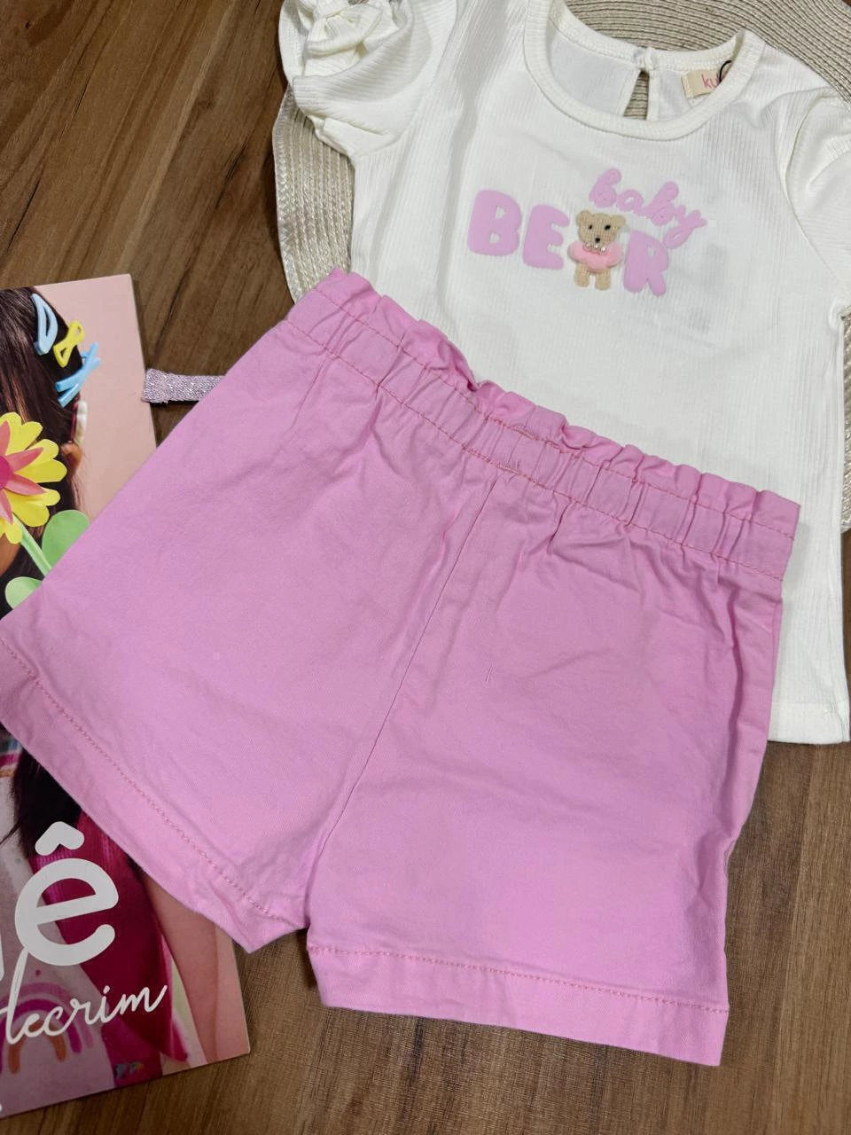 Invista no conforto e estilo com o Conjunto Infantil Blusa Canelada Ursinha e Short em Sarja Rosa Kukiê!