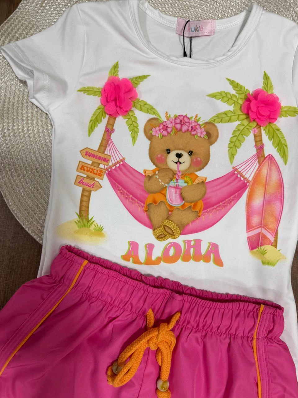 Com estampa divertida de ursinho na praia, essa combinação traz um toque de charme e alegria, combinando perfeitamente com a energia das meninas. O tom rosa do short adiciona delicadeza e frescor ao look, tornando-o versátil para várias ocasiões.