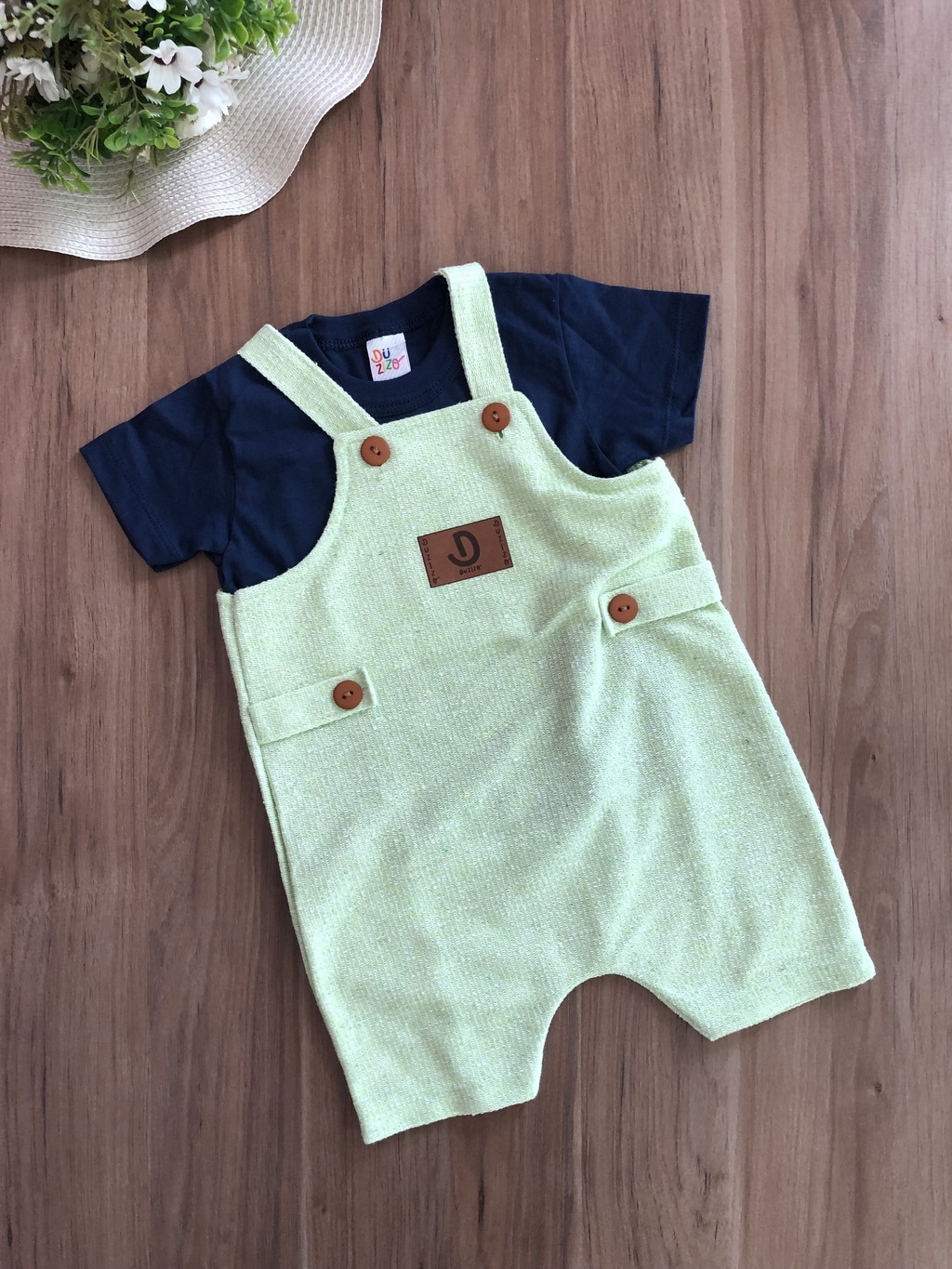 Conjunto Infantil Camiseta Azul Marinho e Jardineira em Malha Verde Neon